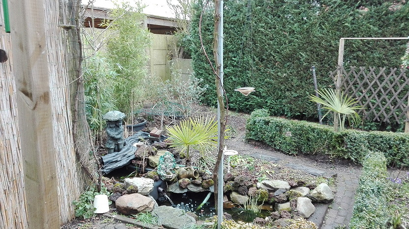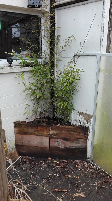 Enkele foto's van vandaag. De bamboe allemaal in bakken gezet en rond de bakken, nu nog zichtbaar, varens. Tevens snoeisel opgeruimd en grond klaargemaakt voor planten van coniferenhaag aan de noordkant. Komen ook nog rieten matten tegen die muur. Tevens klimrekken voor diverse klimmers klaar en de wisteria en trompetplant heel kort gesnoeid.