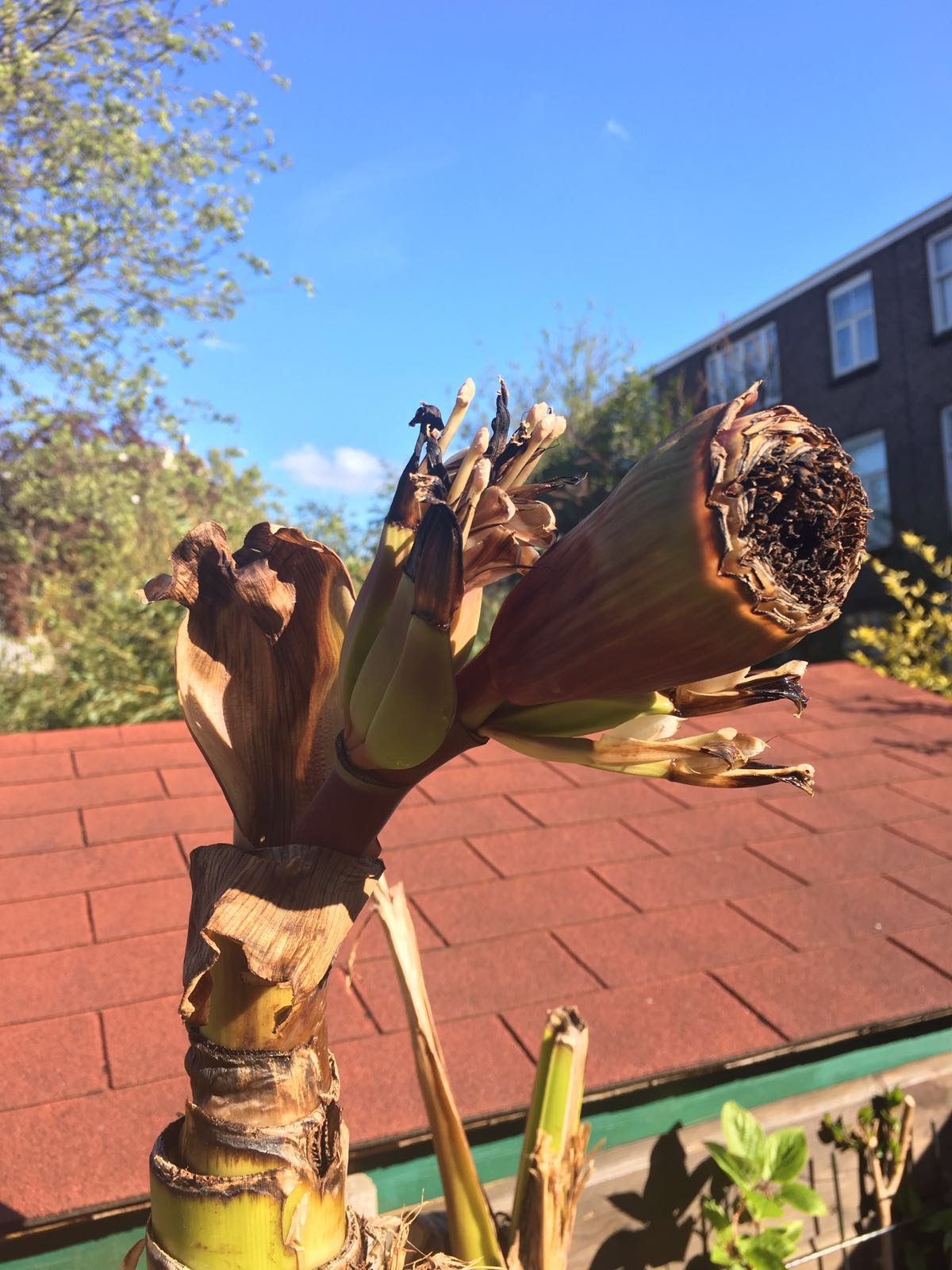 Hij staat intussen buiten in de volle grond en bloem begint te openen alleen voor mn gevoel iets te vroeg. Maar ik zie we degelijk banaantjes zitten. Het wordt vannacht nog even koud maar in het westen gelukkig geen nachtvorst :)