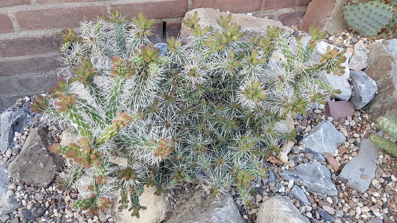 Mate: de begin opzet als lange strook met cactussen en yucca's door elkaar is helaas mislukt/gewijzigd. Heb nu een bult stenen tegen de gevel met een mengsel van potgrond, klei, zand en grind ertussen waar de cactussen met zn allen in staan te bakken op het zuiden. Van de yucca's het 1 en ander verloren in de loop der jaren helaas. Dit jaar weer vanuit het niets 2 uitvallers die het 3 jaar prima leken te doen :?