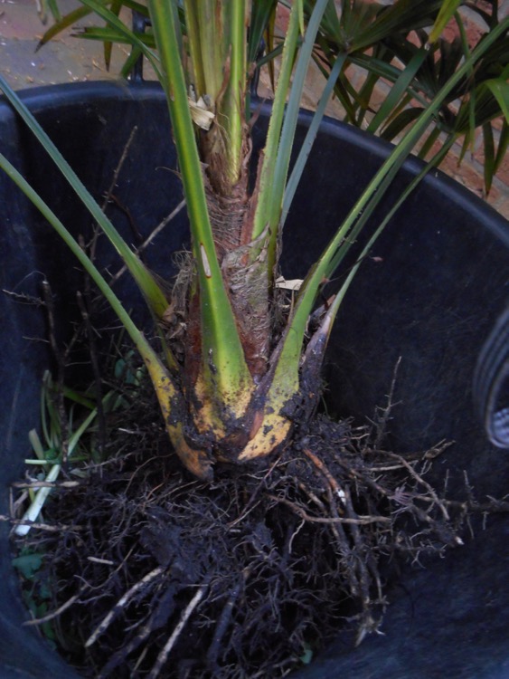 Ik heb Trachycarpus takil 'Kumaon' uitgespit omdat het een lelijk geval vind. Nu en dan is een 'hard' ingrijpen onontkoombaar :roll: De snelgroeiende palm bood stevig weerstand met een goed ontwikkeld wortelstelsel. Het aanhoudend 'ziekelijke' beeld heeft daarom waarschijnlijk geen 'ondergrondse' oorzaak?