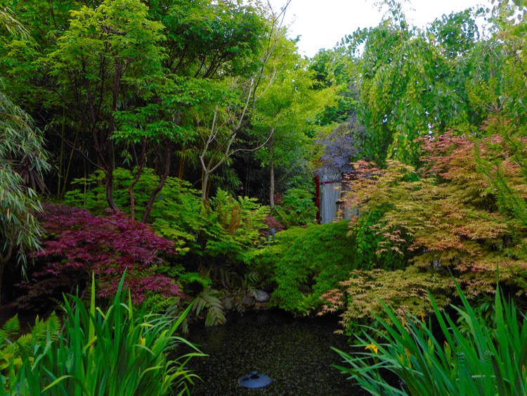 Met het donkerrode blad is Cercidiphyllum japonicum 'Rotfuchs'. Dit is een langzame groeier vergeleken bij de soort. De plant rechts daarvan is Acer x conspicuum 'Silver Cardinal' (synoniem Acer rubescens 'Silver Cardinal'). Deze bontbladige Acer is gevoelig voor zonnebrand zoals veel variëteiten Japanse esdoorns. Het verzamelen van Acers is een van mijn passies en ik kan de verleiding vaak niet weerstaan om weer met een cultivar thuis te komen. Voorlopig is zo 'n nieuwkomer gedoemd in een kuip te verblijven totdat ergens een plek vrijkomt.