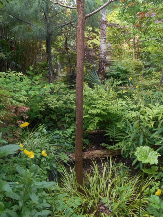 Met het donkerrode blad is Cercidiphyllum japonicum 'Rotfuchs'. Dit is een langzame groeier vergeleken bij de soort. De plant rechts daarvan is Acer x conspicuum 'Silver Cardinal' (synoniem Acer rubescens 'Silver Cardinal'). Deze bontbladige Acer is gevoelig voor zonnebrand zoals veel variëteiten Japanse esdoorns. Het verzamelen van Acers is een van mijn passies en ik kan de verleiding vaak niet weerstaan om weer met een cultivar thuis te komen. Voorlopig is zo 'n nieuwkomer gedoemd in een kuip te verblijven totdat ergens een plek vrijkomt.