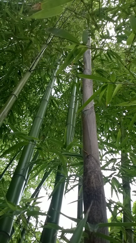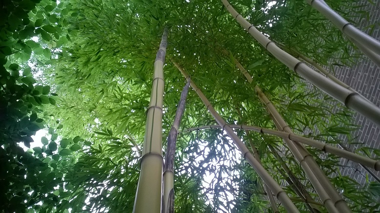 Het moet een overweldigende entree worden. Als je door de tuindeur binnen komt moet je rechts van je en boven je de manicata zien, daarna Phyllostachys aureosulcata aureocaulis (ook zo'n 5 a 7 meter hoog en over het pad hangend. En links dan een heuveltje op zijn plaats gehouden door een Ardenner Breuksteen muurtje en grote Musa's zodat je door een tunnel van groen loopt.