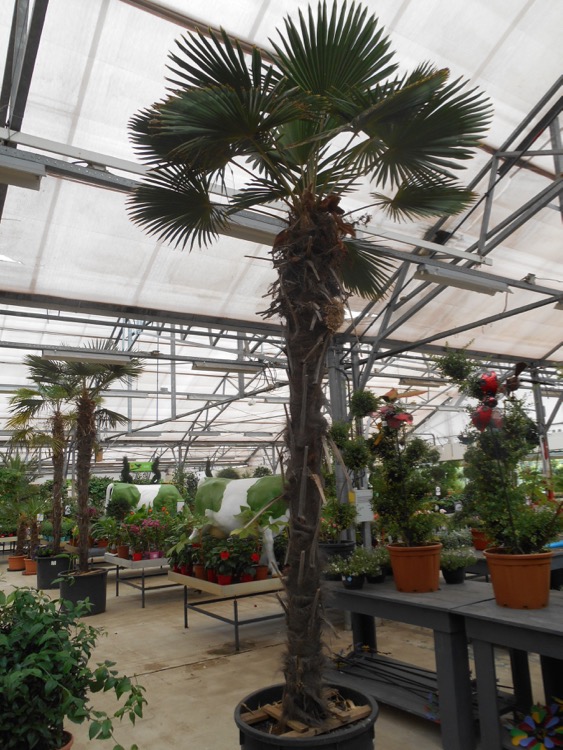 Deze Trachycarpus (onder oude naam Chamaerops excelsa) staat al een ruim een jaar bij Overvecht. De stamlengte bedraagt ongeveer 3 m. Eigenlijk moeten ze 's zomers naar buiten maar dat is er dit seizoen nog niet van gekomen. De vraagprijs van € 300 lijkt me reëel voor deze palm met z 'n strakke waaiers ?