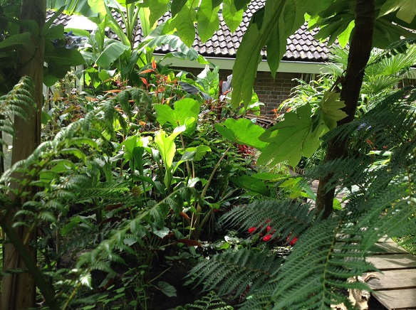- Zijaanzicht tuintje. Colocasia Jack's Gaint.