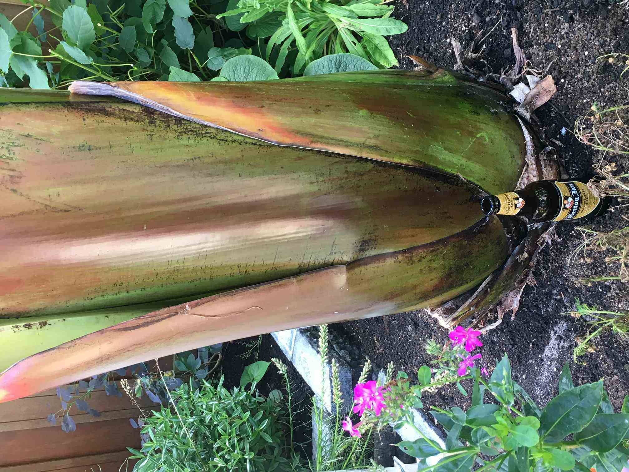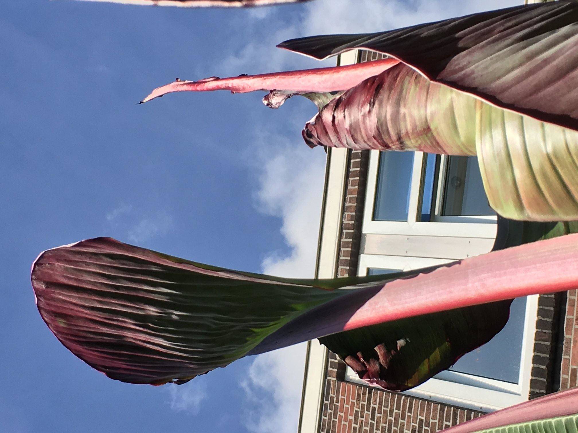 Ik zou niet te snel gaan snijden. Je zal niet de eerste zijn die toch een bloem weg blijk te snijden terwijl het een verstopping lijkt. Verstoppingen komen normaal toch enkel voor na de winter, of onder slechte omstandigheden. Voor zover ik weet krijgt een gezond groeiend Ensete niet zomaar een verstoppen. Mocht dit het toch zijn, dan kan je het beste met een scherp mes van bovenaf het hart voor een gedeelte wegsnijden. Op die manier kan je de bladerkruin behouden, maar kan je toch de verstoppen wegsnijden. Je ziet er verder niks van, zeker niet bij een groot exemplaar, al zullen er wel eerst kapotte bladeren uitkomen. Is hier al vaker geluk, al was dat wel bij kleinere exemplaren. Maar of het groeipunt voor de winter nog herstelt zal moeten blijken.