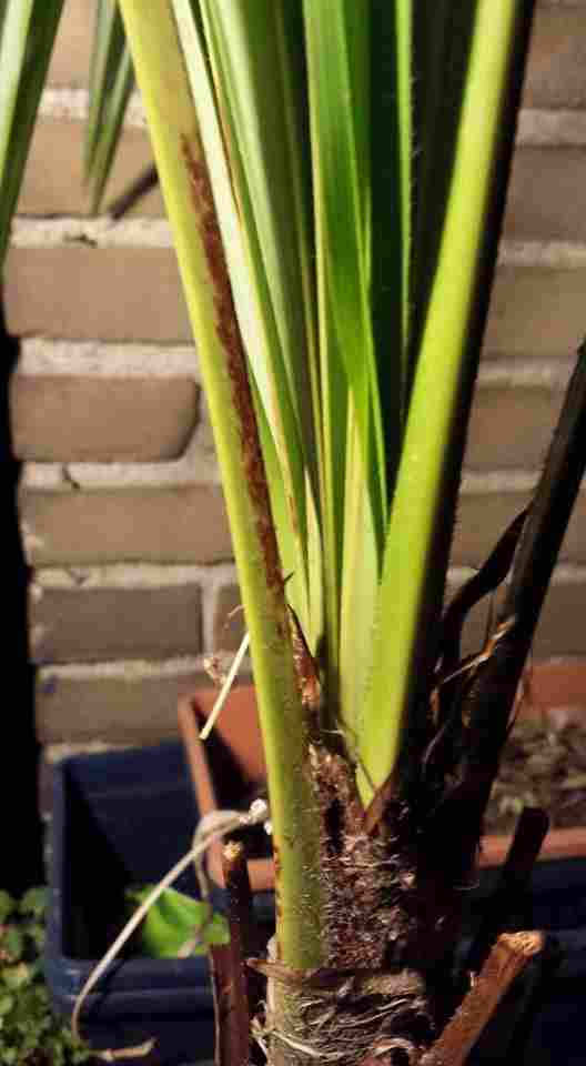 Het lijkt wel alsof het een soort pigment is ofzo. Wat voor vlekken had jij dan? Misschien is t wel 'normaal'. Ik vind het blad extreem gevoelig voor wind met als gevolg dat zelfs op een beschutte plek ze een beetje rommelig er uit zien. Aan de andere kant ben ik verliefd op de kale haarloze stam. Hij is ook vrij dik. Ik vind het veel meer een subtropisch idee hebben. Fortunei's, vooral de slappere cultivars, vind ik extreem lelijk en ieltjes. Bij Fortunei's koop ik daarom of sterke cultivars met blauwe bladeren of de Nainital die ook veel robuster uiterlijk heeft. Vooral bij de Wagnerianus vind ik al dat haar vreselijk lelijk staan al zijn de stijve bladeren zo mooi. Gardenpalms meent dat de Kumaon in volwassen staat toch winterharder dan (de slappere cultivars van de) Fortunei. Om die reden heb ik hem toch aangeschaft. Alleen dat blad is jammer. Ik verwacht echt dat de echte Kalamuni Takil de perfecte palm zal zijn. Stijvere bladeren en een kale stam die ik persoonlijk mooier vind. Alleen groeit die zo traaaaag...... Om die reden dat ik toch een licht zwak voor de Kumaon heb. Al irriteert het blad me extreem. Ik heb me daar toch maar overheen gezet vanuit het idee dat hij als hij groot is toch wel erg mooi er uit kan zien.