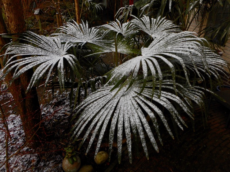 Mij rest nu niet anders dan die oude meuk er maar van af te knippen. Die hangen nu in het gras. Met een palm als de Trachycaprpus fortunei is dat zo'n punt niet. Die heeft er binnen een jaar zo weer 5, 6 nieuwe bladeren bij, die WEL de sneeuw aankunnen.