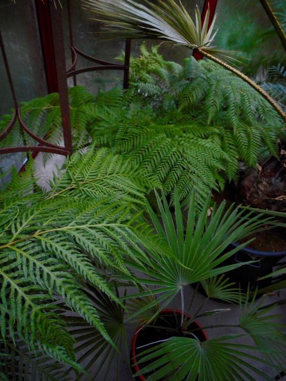 Een kas of serre is de ultieme oplossing voor de overwintering van exotische kuipplanten. Je hebt vrijwel geen omkijken naar de planten die bij de lage temperaturen en hoge luchtvochtigheid nauwelijks water behoeven. Om een goed beeld te geven is best lastig omdat de planten zo dicht opeen staan. Ik hoop dat deze poging daar enigszins in slaagt. Het is veel erger geweest en in voorgaande jaren moest ik me vaak op de knieën tussen de planten doorwurmen om hier en daar een drup water te geven. Zodra de zon aan kracht wint vanaf maart, kan de temperatuur overdag flink oplopen en stijgt de waterbehoefte.
