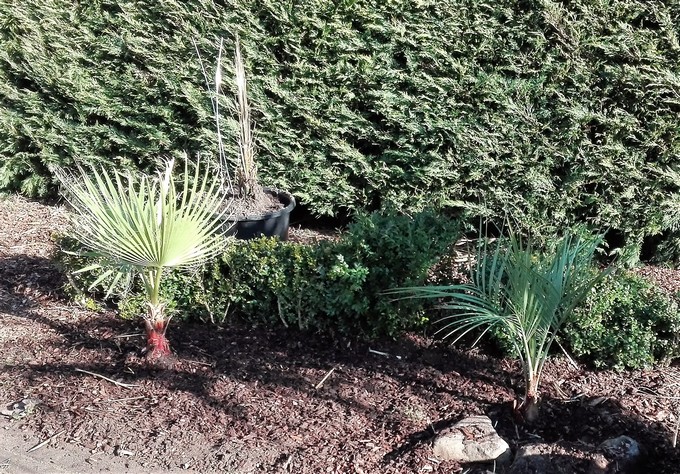 Let wel op met de zon op die nieuwe aanplant Ed. De zon kan zelfs nu al verraderlijk scherp zijn op palmen. Zal op Butia yatay en armata wel meevallen, maar op de zachtere bladeren (bij Washingtonia) kan dat al snel leiden tot verbranding.