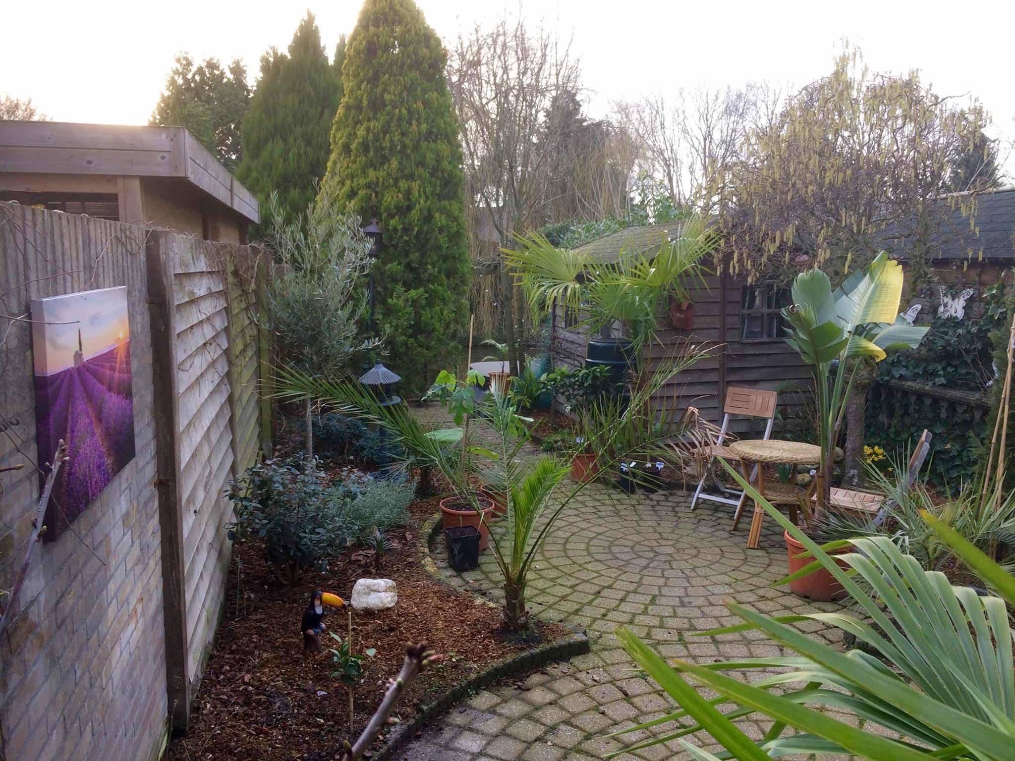 Dit jaar heb ik de stenen verwijderd en planten in het midden van de tuin geplaatst. Er komen grindpaadjes omheen met stapstenen. Ook heb ik wat nieuwe klimmers en bamboes gekocht, zodat alles mooi dicht kan groeien. De potplanten zijn verhuisd naar de serre en naar het plateau bij het water.