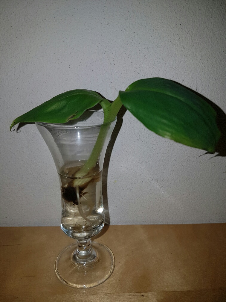 Experimentje, heb bij het verwijderen van grotere pups met wortel een kleine afgebroken zonder wortel en in water gezet met ietsie pietsie palmbooster en de mini pup van slechts 5-10cm 2 blaadjes heeft het lijkt het gered want er zitten al 4 wortels aan. Mss voor velen hier geen verrassing meer maar dacht dat het leuk was om te delen en de voortgang met foto's te delen. Zag nog geen posting van 2 blaadje naar volwassen. Volg Bonne's link met veel plezier en hoop dat er een mooie bloem inkomt dit jaar, mijne van 2 meter is helaas door koude verrot :(.
