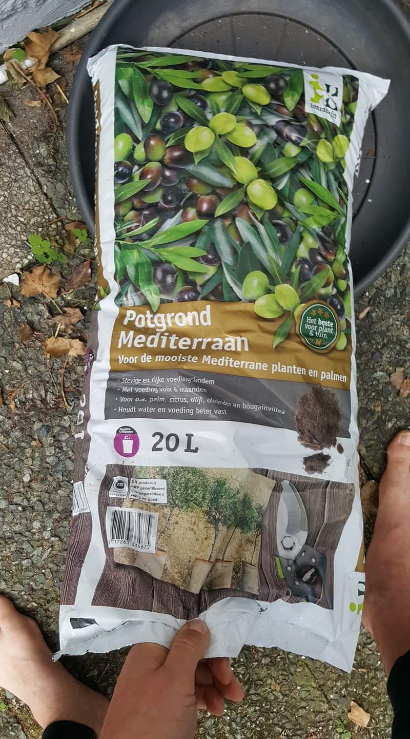 Niet alleen bij het verpotten, maar altijd al gebruikt. mediteranen grond van de Intratuin.