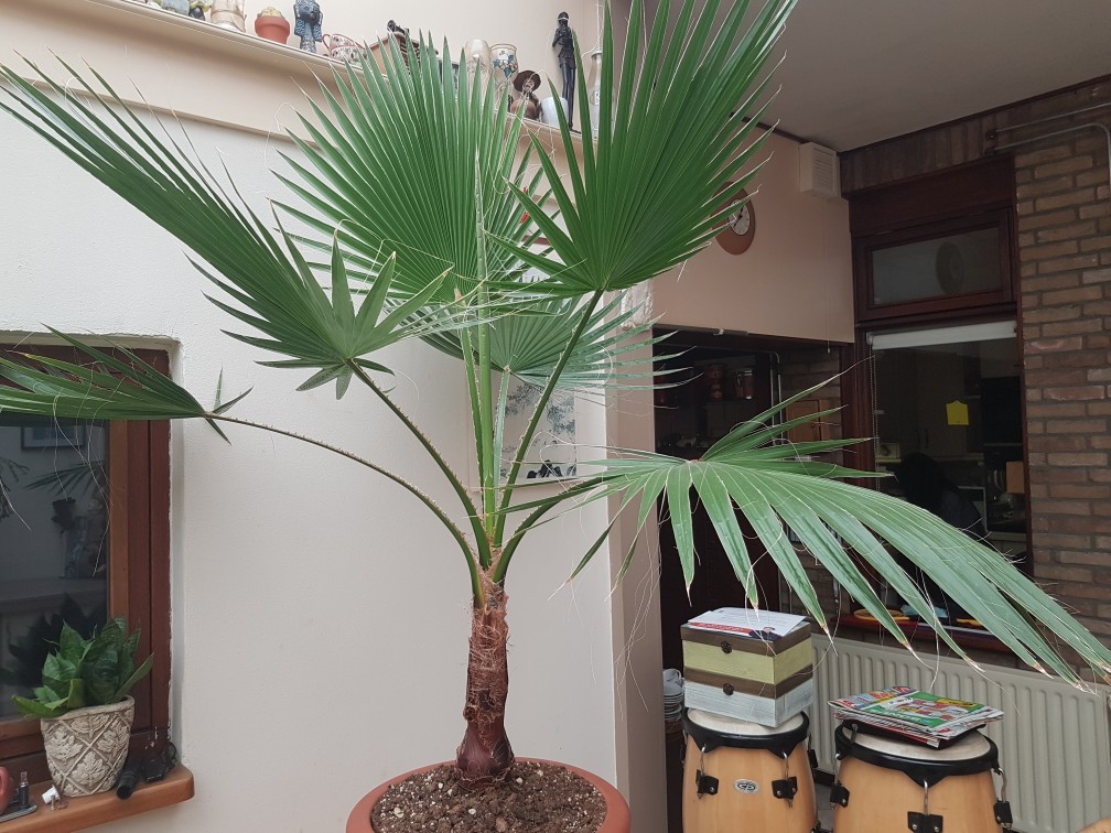 De trachy zit nu op 30cm en stammetje begint aardig te vormen 10cm, de Phoenix met bladlengte van 90cm en de Washingtonia 135 cm en stam 40cm, die groeit de pot uit nu en gaat dit weekend zijn final upgrade pot in.