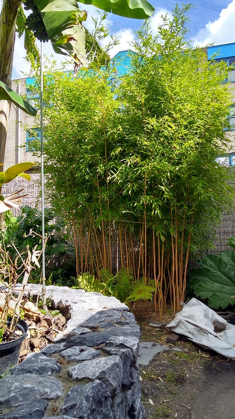 De Phyllostachys vivax aureocaulis die je hebt gefotografeerd kan tot wel 15 meter hoog worden. Het onderste deel is dan alleen kale stam. Met flink snoeien blijft hij wel kleiner maar zo'n reus moet je eigenlijk niet zo klein willen houden.