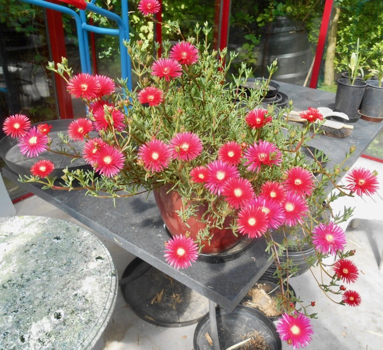 Weet iemand de naam van deze vetplant. Gelijkt op Mesembryanthemum (ijskruid). De verkoper noemde de naam 'Mesoproteum' maar daar weet Google geen raad mee. De knalrode bloemen zijn geheel gevuld.