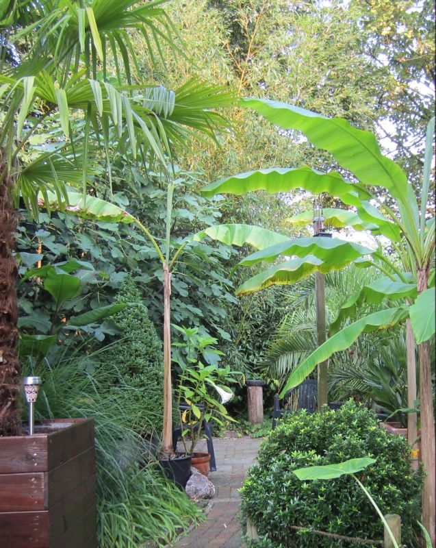 Heb de M. basjoo pol vanuit overwintering in 50L pot droog/binnen op rond 0°C in maart in de grond geduwd met een zak koemest en wat ander ongerief, en de groei erop is van 1 seizoen...