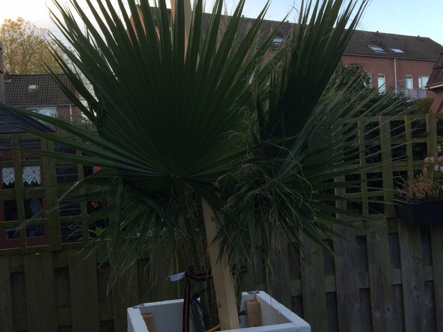 Vandaag een hok gebouwd om mijn Washingtonia. Ik heb maar eens flink uitgepakt want ik wil dit keer eens geen blad verliezen of met bladschade de winter uitkomen. Afgelopen week de eerste keer vorst in de tuin, maar ik had voor de zekerheid maar even een zeiltje eroverheen laten hangen. Dit om te voorkomen dat bladeren weer zouden verkleuren zoals ik nu al vaker heb gehad. Alle bladeren luchtig samengebonden met jute van de rol, ademende plantenhoes eroverheen, omwikkeld met een warmtekabel-met-thermostaat, vervolgens 2,5 m hoog hok eromheen gebouwd met gewapend folie en golfplatendakje. De plant staat tegen mijn overkapping aan, dus het hok met de achterkant tegen de overkapping. Deze zijde blijft lekker open zodat er volop frisse lucht is. Nu dus goed aangepakt en niet zo nonchalant als voorgaande jaren. Was toen ook eigenlijk maar een proefkonijn, maar inmiddels besloten dat dit voorlopig een blijvertje mag zijn.