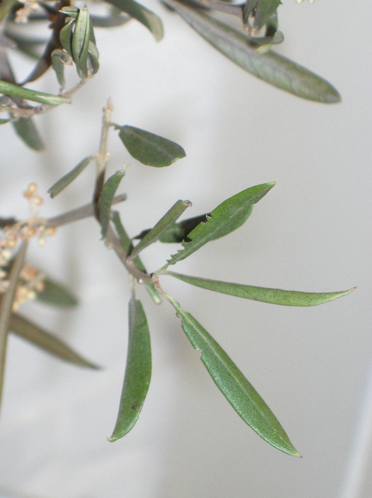 Het gaat al een tijd niet goed met de olijfboom (wolluis, weggehaald en bestreden met te veel water waardoor de bladeren gingen krullen en hij veel blad verloor). Nu worden juist die overgebleven jongste, buitenste bladeren aangevreten door iets. Ik hoopte eerste dat het vanzelf over zou gaan, maar het wordt alleen maar erger. Ik vraag me af of het (oleander)dopluis is. Er zijn zwarte vlekjes te zien die meer op poepjes lijken. Ik heb twee foto's bijgevoegd waarop je enkele zwarte stipjes ziet en de vraat. Als ik nu nog meer bladeren ga weg halen, ben ik bang dat er helemaal niets meer overblijft van mijn olijfboom...