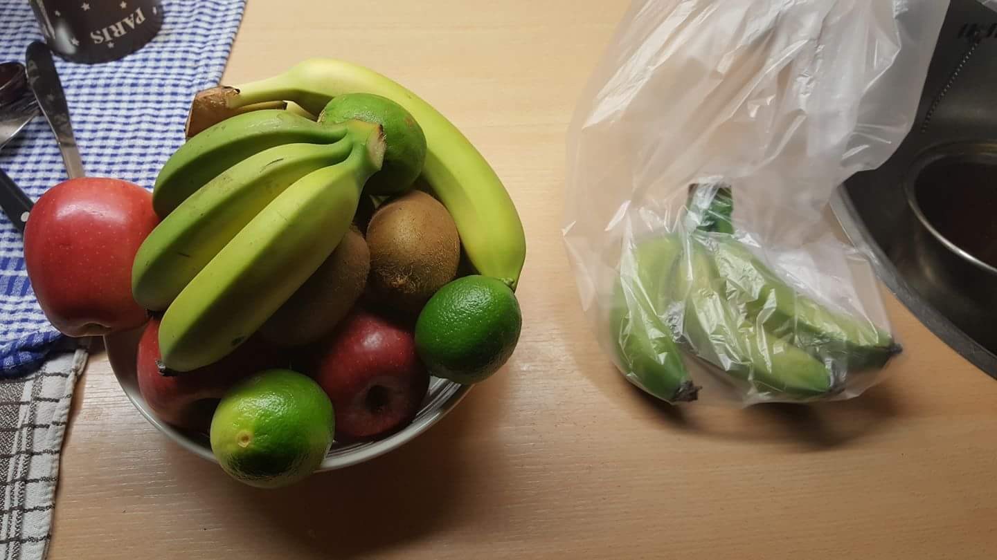 Doe er drie terug in de zak en de andere drie tussen het ander fruit op de fruitschaal.