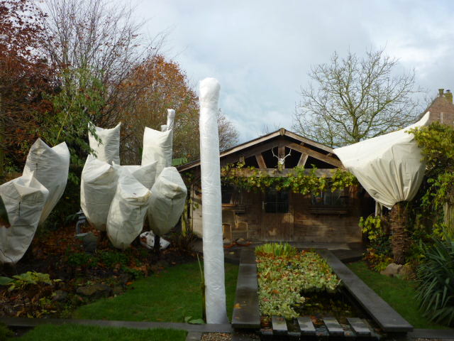 dit jaar geen tentjes rond de palmen maar zakken speciaal voor planten eens proberen (gaat wil veel sneller) ik heb dit jaar ook pvc buizen van dia 16cm omwikkeld met eerst schuimfolie enkele lagen daarna met nopen folie en daarna met winkelfolie om alles samen te houden zijn nu afgewerkt 26 cm dik ,dus toch rondom 5cm bescherming. de bladeren van de bananenboom en er gewoon laten overglijden is er ook vlug op en af in het voor jaar moest het plots terug nachtvorst zijn. :thumb_up: