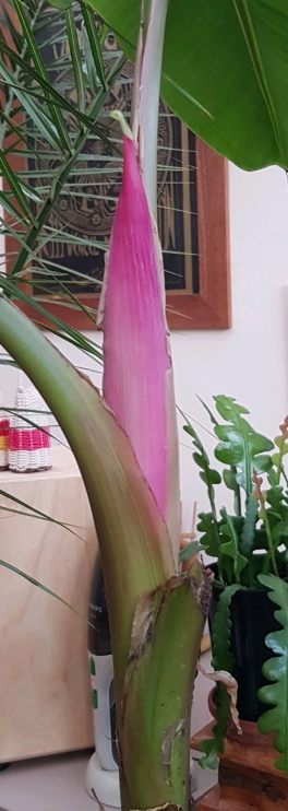 Hier nu weer 1 volle week na 1e waarneming, 1e schutblad met mini bladje op de top lijkt zich te gaan openen. bobbeltjes in de bloem verraden de kleine banaatjes al, mooi proces om te volgen.