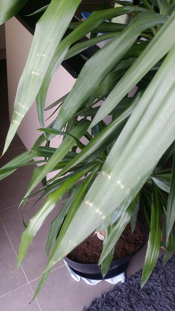 -Op bepaalde bladeren van mijn yucca vind ik kleine beschadigingen terug +- 1 cm (zie foto) zou dit het werk kunnen zien van insecten of zou het kunnen komen van verbranding aan gezien de yucca plant in de zomer voor een grote schuifraam staat en er nogal een felle zonlicht op straalt? Yucca plant is circa 2 jaar oud.