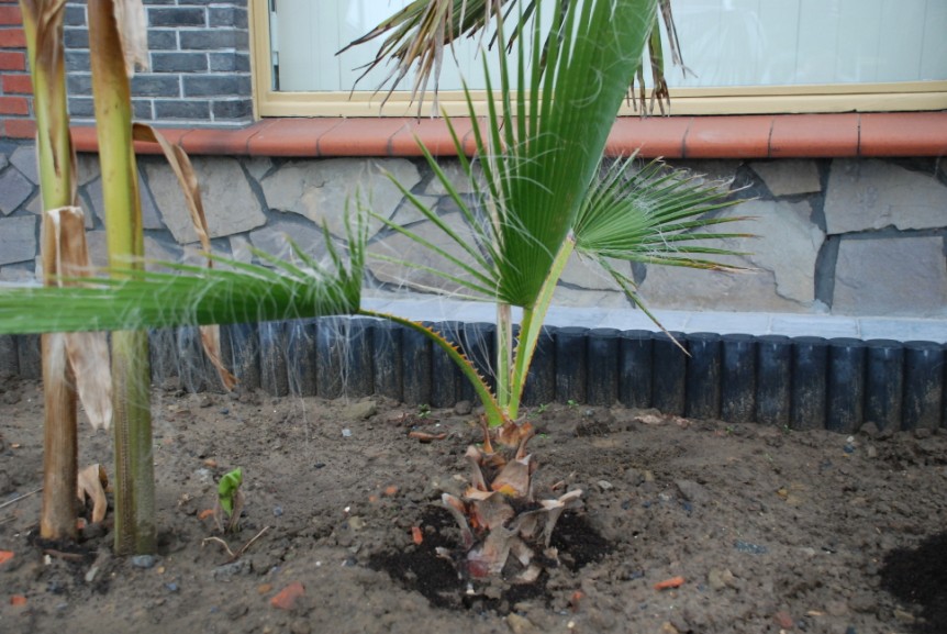 Ben je eigenlijk niet bang dat de Washingtonia te dicht bij de Trachy staat?