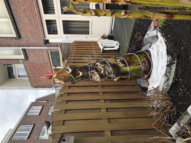 Ensete gaat nog lekker.. hopelijk start hij met een lekkere groei spurt komende relatief warme dagen. Hij staat alleen een beetje schuin omdat hij vorig jaar naar het licht wilde groeien. Denken jullie dat ik hem nu al een beetje eecht kan stutten?