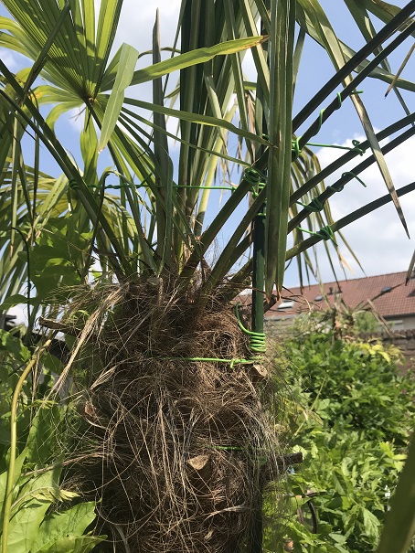 Op de foto ziet de Palm er redelijk goed uit maar in de werkelijkheid ziet het er niet best uit. De takken hangen veelal naar beneden, zowel de oude als de nieuwe takken. daarom heb ik deze bij elkaar gebonden om dit doorzakken verder te voorkomen. Zoals je ziet zijn de bladeren ook allemaal geknikt, ik denk door de wind.