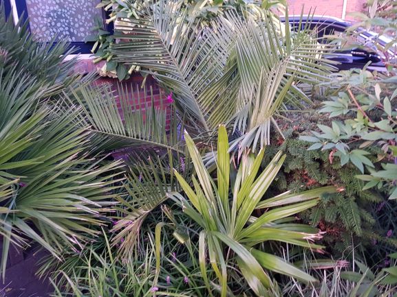 Ook de Jubaea en de Chamaerops in de voortuin groeien gestaag door. Geen harde groei en dat zie je gelukkig terug in de in mijn ogen perfecte groeivorm. De Jubaea met stevig, compact en enigszins gedraaid blad en de Chamaerops met dikke, korte bladstelen en een fraai bossig uiterlijk. Op de voorgrond een Rhapidophyllum welke langzaam maar gestaag groeit en bloeit. Drie bladeren dit jaar en een viere lukt misschien nog net. En de Bougainville, ook zo'n heerlijk succesnummer wat vrijwel aaneengesloten bloeit vanaf eind juni, begin juli. Nu is er weer een extra bloeigolf met massa's bloemen, het gaat maar door.