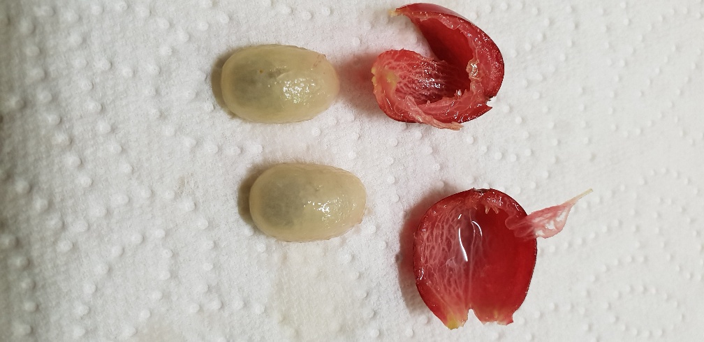 Eerste rijpe zaden uit hun jasje gehaald. Vruchtvlees smaak licht zoetig en volgens insiders uit de koffie business dus eetbaar ;) .