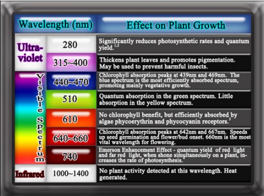 Het lichtspectrum van gewone verlichting is afgestemd op de gevoeligheid van het menselijk oog en dat is vooral gevoelig voor het groengele deel van het lichtspectrum. Zoals uit de afbeelding blijkt is dat juist het deel dat weinig tot niets bijdraagt aan d plantengroei. Het wordt grotendeels gereflecteerd, vandaar dat planten groen zijn.