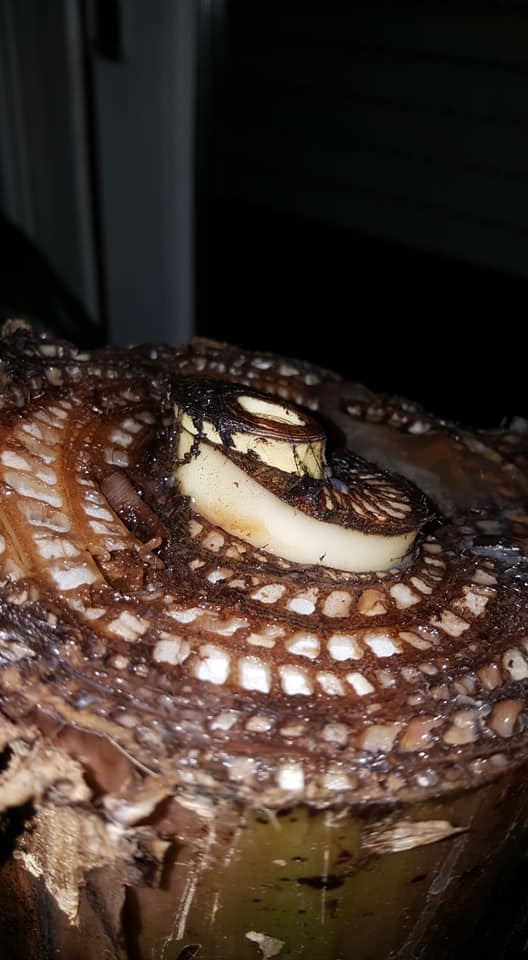 De stam maar eens verticaal doormidden gesneden en je zag inderdaad in de kern het begin van het einde.