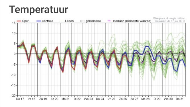 Waarom zouden die grafieken suggestief zijn? Het is puur de uitdraai van een weermodel. Het zijn vijftig scenario's, daarvan zijn er twee lijnen (Oper & Controle) met een hogere rekenkracht dan de overige 48. Na drie tot vijf dagen geeft zo'n pluim (het gemiddelde ervan) eigenlijk alleen een trend weer. Nu is het er een die aanhoudend temperaturen om en nabij het vriespunt aangeeft. Niks meer, niks minder.