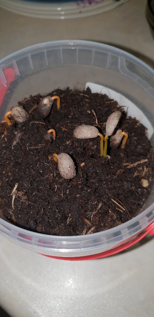 Ook van mijn 2e batch gezaaide koffiebonen drukken de bonen inmiddels het zand omhoog na 22 dagen in de nabijheid van een radiator ook in een snoeptomaten emmer met aan de bovenkant luchtgaten.