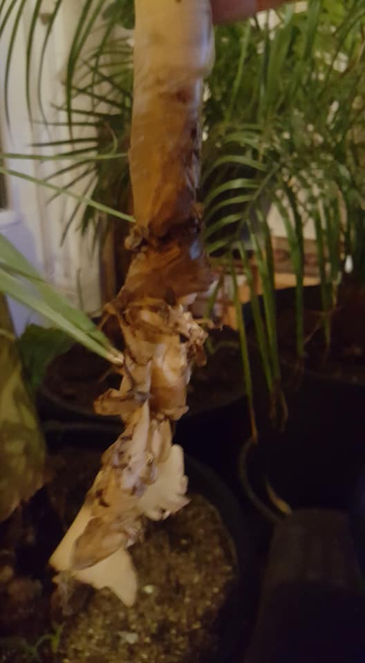 Onder het snijden zag ik dat er in de stam, het nieuwe blad daaronder als een harmonica in elkaar was gedrukt.