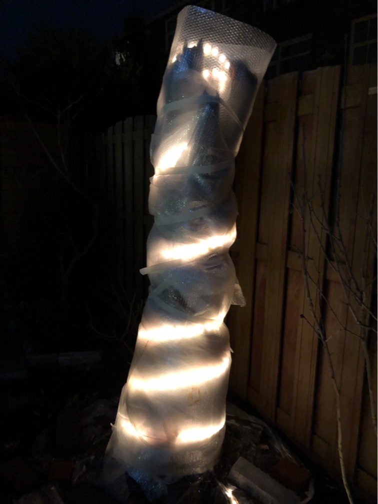 Heb je er een thermometer bij gestoken? Kun je een beetje bijhouden wat de temperatuur doet? Mijn ervaring is dat het op deze manier erg warm kan worden binnen de bescherming. Goed dat je een opening hebt aan de bovenkant, dan kan er ook warmte weg. Ik denk dat je moet proberen om deze op circa tien graden te houden. Niet warmer en kouder misschien even, maar niet te lang. Zou wel supergaaf zijn als je deze zo de komende periode door krijgt, ik ben benieuwd!.