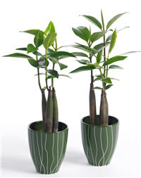 Opvallend is de verdikte, min of meer flesvormige stam, met daarop een toefje spitse, frisgroene blaadjes. De plant wordt verhandeld met drie stengels, wat een mini-mangrove met een stijlvol silhouet oplevert. Alleen het getijde moet er zelf bij worden gefantaseerd.