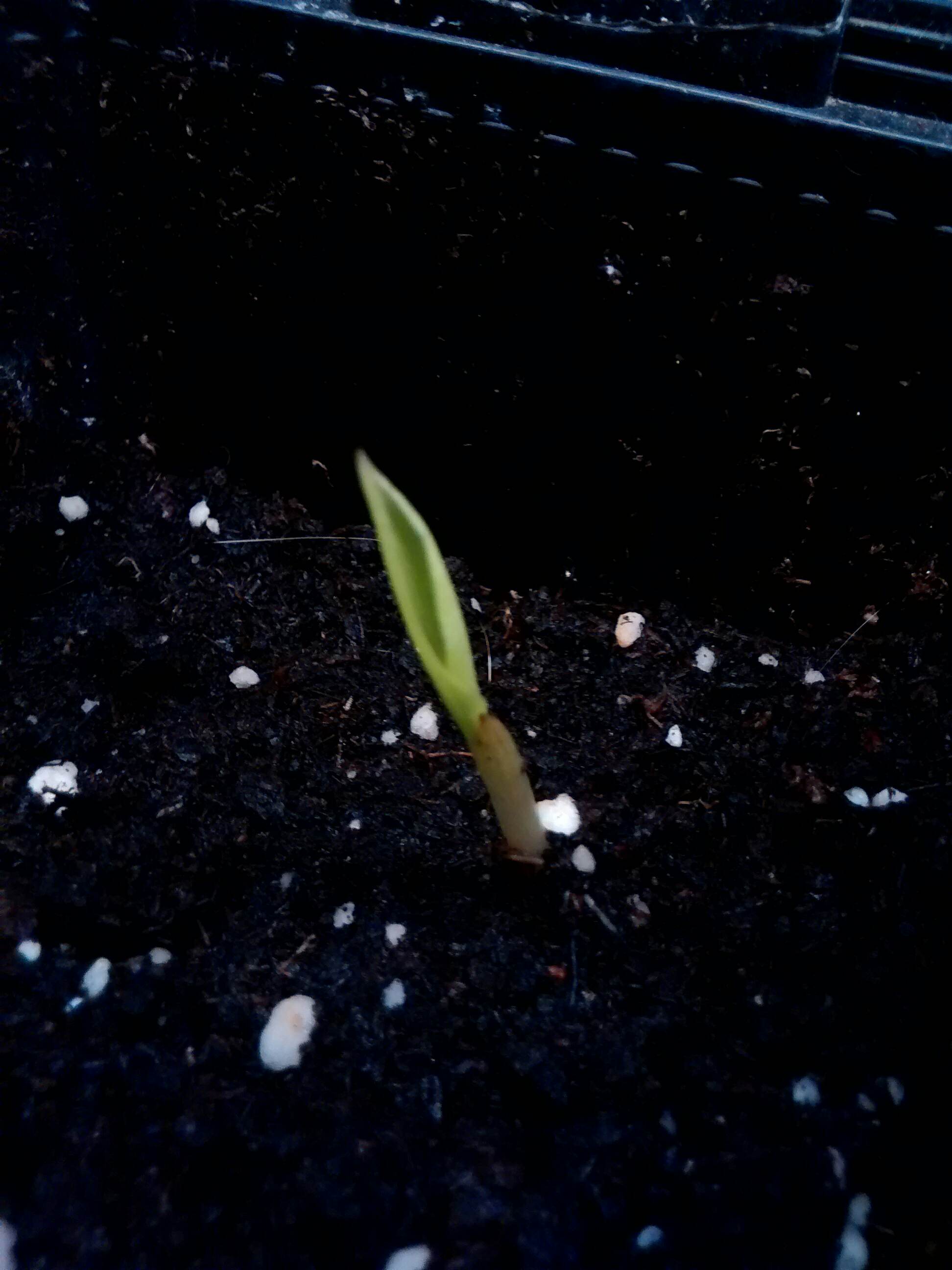 Eerste blad is duidelijk zichtbaar en nummer twee is onderweg. Ik merk wel wat verkleuring aan het uiteinde. Hopelijk blijft dit stabiel...