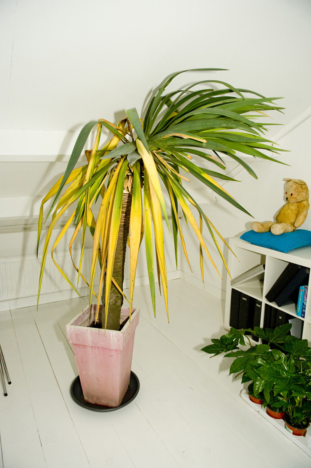 We hebben een grote yucca glorios variegata in de tuin staan. De onderste bladeren worden steeds bruin, dus halen we die eraf. Maar nu is de stam zo hoog aan het worden, dat hij dreigt om te vallen, en we hem met een touw aan de muur moesten vastmaken. Maar hij blijft maar hoger worden.