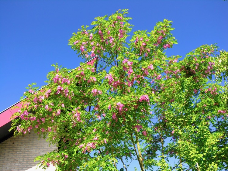 Verbazingwekkend dat dit bedrijf nog bestaat? Ik heb één keer een plant besteld bij Bakker of misschien was het Willemse. Ik werd verleid door hun onnatuurlijk kleurrijke geïllustreerde folders op de deurmat. Ik had een Robinia besteld met geel blad en rode bloemen. Er werd een kaal boompje bezorgd waaruit alle levenslust ontbrak. Mijn klacht werd routineus ontweken en ik kreeg iets knulligs ter compensatie. De speciale Robinia met geel blad en rode bloemen bestaat wellicht niet. Ik ben deze vorm nooit meer tegengekomen. Ik heb verschillende varianten in de tuin gehad, 'Frisia' met geel blad, 'Casque Rouge' met dieprose bloemen, 'Hispida' rosebloeiend en 'Myrtifolia'. Geen van de snelgroeiende Robinia' s bleek opgewassen tegen storm en slagregens in de onbeschutte tuin. Takken braken of scheurden in. Ik heb het uiteindelijk losgelaten en de valse Christusdoorns Gleditsia 'Sunburst' en 'Ruby Lace' aangeplant.