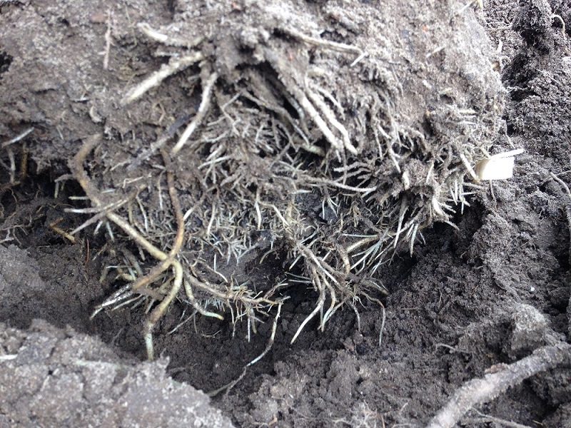 Hij heeft nu een paar weken in de grond gestaan en bleek gelukkig helemaal niets van de klungelige overwintering overgehouden te hebben want de onderkant was in die paar weken alweer geheel voorzien van frisse witte wortels (zie foto)