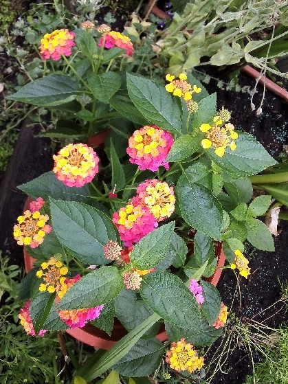 De zelfde kleur lantana staat hier ook met het verschil dat die door de zon bijna geheel roze is bijna zonder geel...