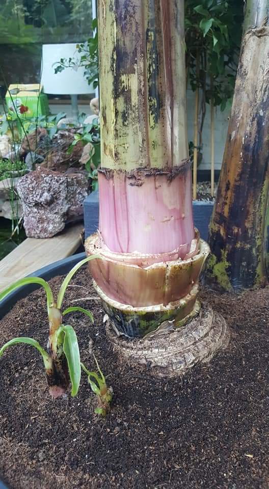Collega met een Bonne banaan stek, ziet nu dat deze niet meer gaat passen in zijn serre.