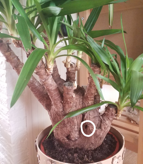 Sinds 4 weken heb ik een prachtige yucca op stam. Nu werden de nieuwe bladeren bruin en ontdekte ik een gat van 1,5 cm hoog en ongeveer 2 cm diep met daaruit knaaggeluiden :o . Ook kan je de kleine stompjes bijna plat knijpen, ze zijn bijna hol *eek*. Ook aan de achterkant zit een gaatje.