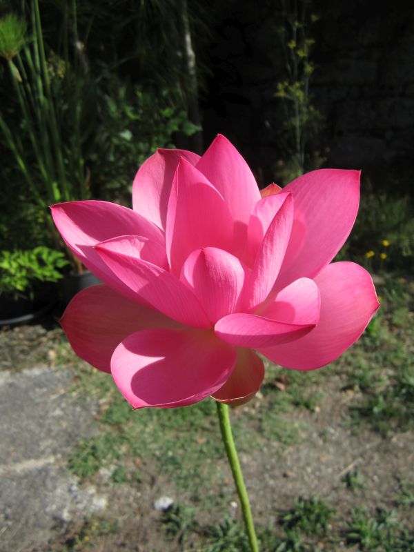 -Nelumbo nucifera een of andere roze variant, die vroeger mooie simpele roze bloemen maakte, maar sinds een paar jaar alleen nog maar dubbelgevulde cremewitte bloemen maakt. Waarom deze verandering snap ik niet.