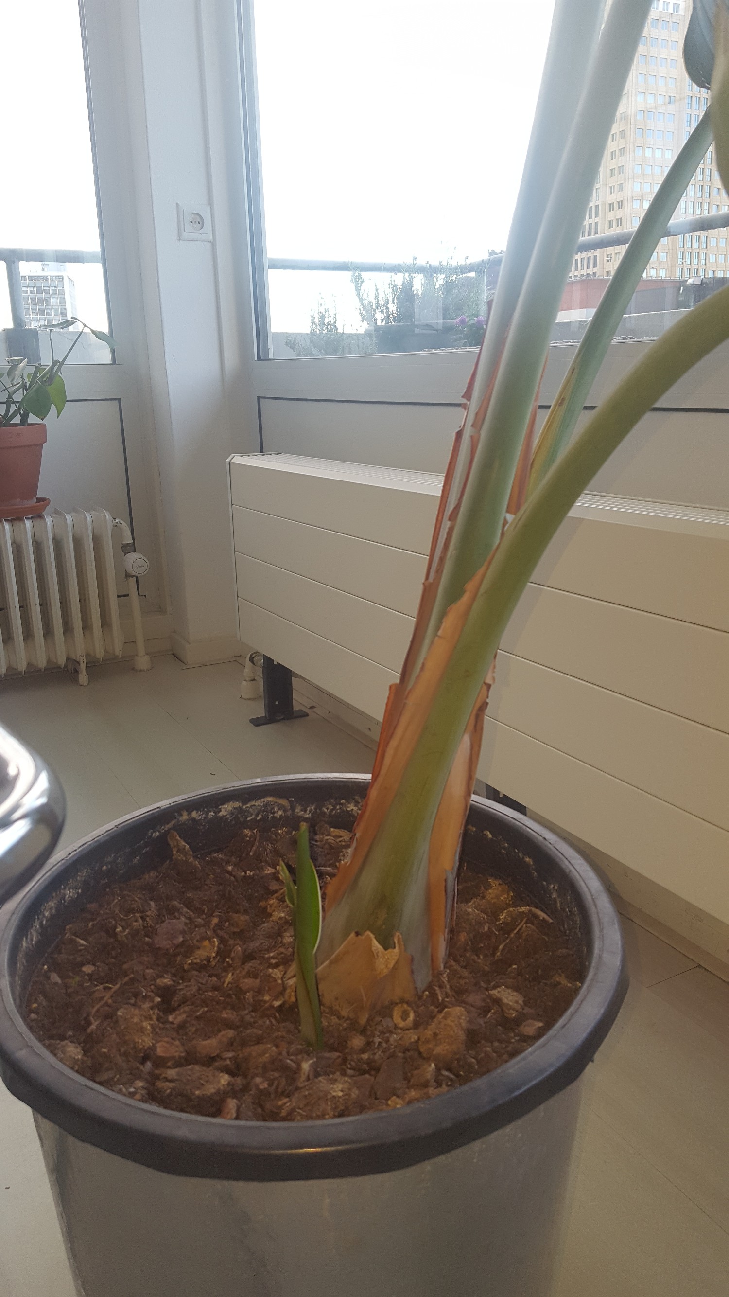 - Verder groeit er een jonge scheut naast de plant (dus los van de stam), is het beter deze weg te halen? Dit jonge scheutje kwam snel op, maar groeit ook al zo'n twee maanden niet meer.