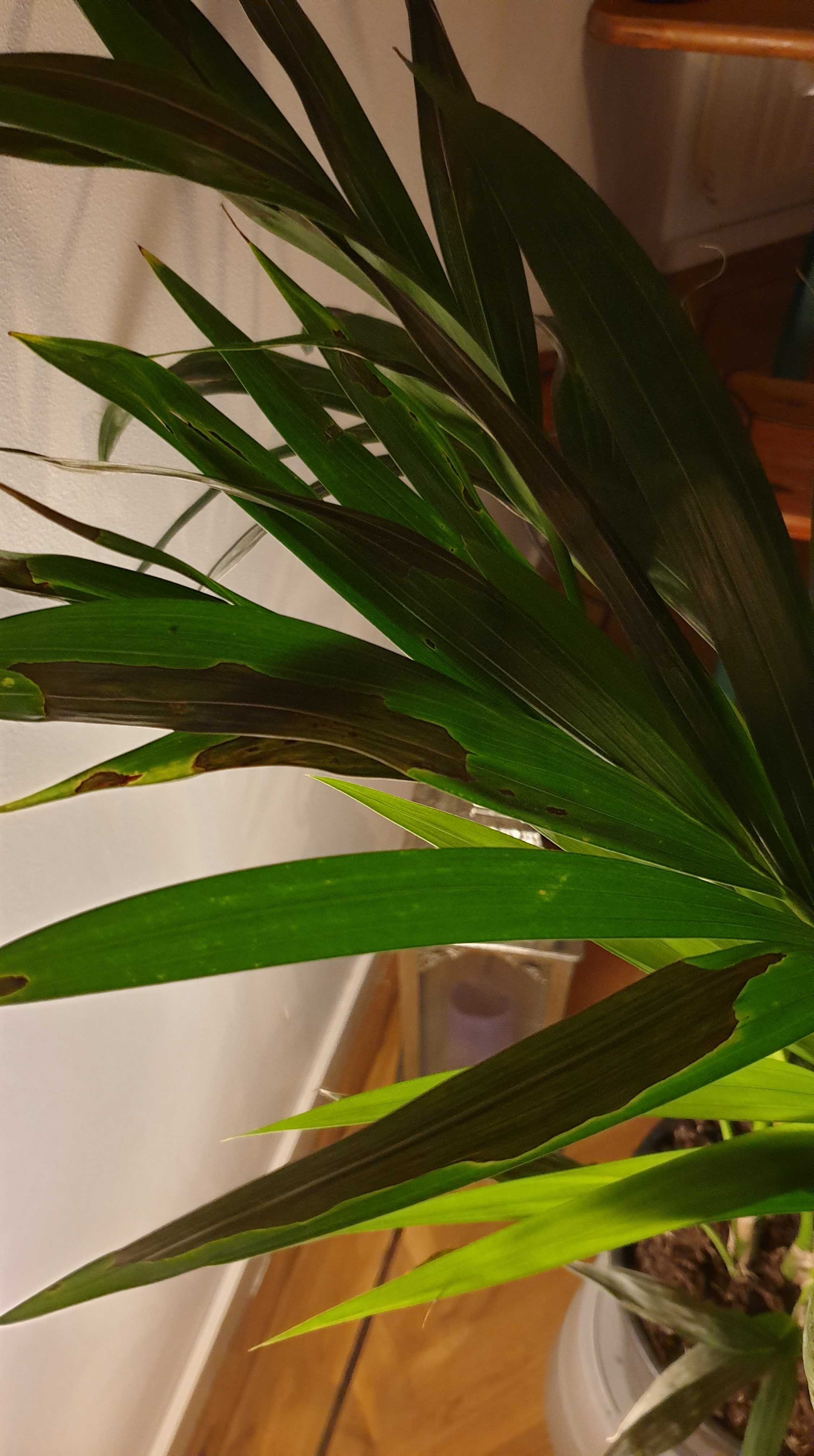 Ik heb sinds een tijd een hele mooi Areca palm, wat al een tijd goed gaat. Genoeg daglicht, genoeg water (denk ik, de grond is droog). Nu ben ik een tijdje weggeweest, ongeveer 3/4 weken, en aan mijn huisgenoot gevraagd of ze in de tussentijd op kon passen. Bij terugkomst waren veel van de kleinere bladeren onderaan helemaal donkergroen en hard, alsook enkele plekjes op de grotere oudere bladeren. Ik heb ze meteen uit de pot gehaald en op een andere plek in huis gezet. Bijgevoegd zijn enkele foto's ter verduidelijking (de donkerbruine plekken zijn meer donkergroen van kleur). Ik ben ten einde raad, en hoop dat hier iemand is die mij duidelijk kan maken wat er is gebeurd, en hoe ik het kan voorkomen!