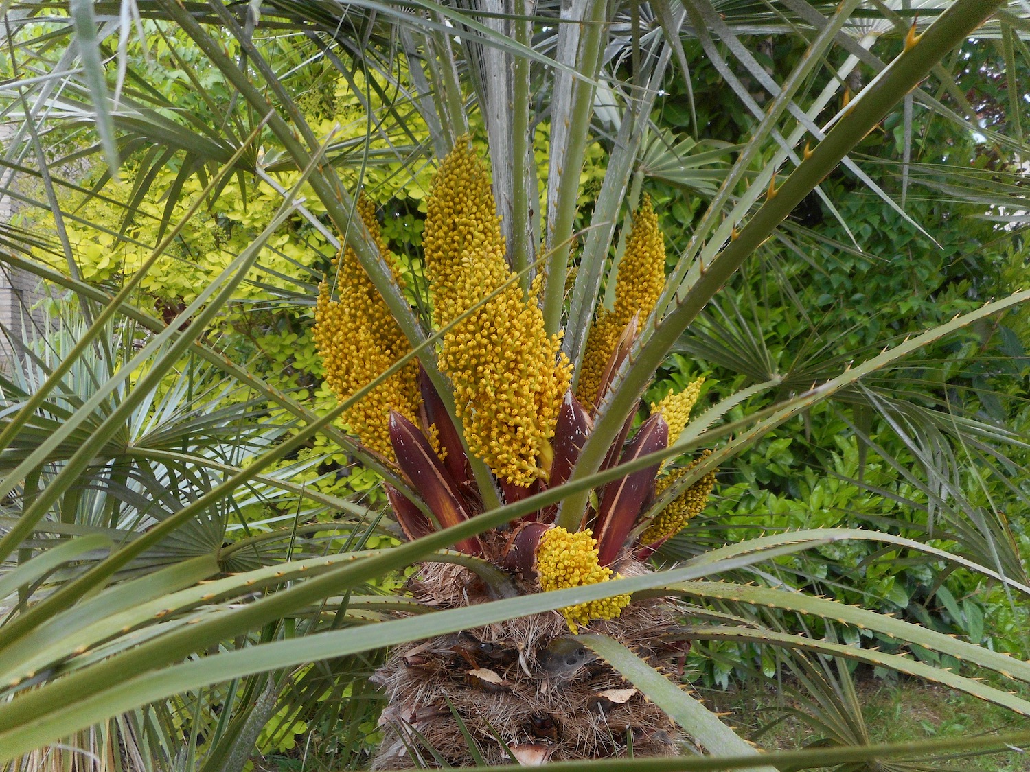 Je kunt ze naast elkaar planten maar voor het aanzicht met voldoende tussenruimte, zodat de kronen vrij blijven. Mannelijke bloeiwijzen hebben doorgaans een compactere bouw. Bij de vrouwelijke bloeiwijze staan de individuele bloemknoppen verder uiteen. Dat is tenslotte nodig om de zaden ruimte te bieden voor ontwikkeling. Hieronder de Chamaerops 'Argentea' van de vorige pagina in bloei. De vrouwelijke bloemen hiervan zijn als zodanig herkenbaar aan het nestje met 3 vruchtbeginsels waaruit na bestuiving de zygotes (bevruchte eicellen) uitgroeien tot zaden. De bloemen van de mannelijke bloeiwijze laten bij aantikken hun stuifmeel (pollen) los die door de wind worden vervoerd ... of met onze hulp.